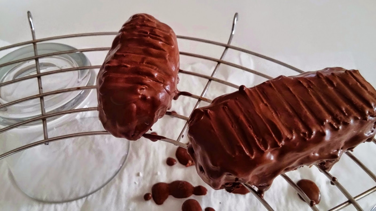 PS : pour celles comme moi qui auraient la mauvaise idée de remettre la grille au frais directement après l'enrobage, pour plus tard ranger les barres dans une boîte... NON ! Les miennes se cassent maintenant que j'essaie de les retirer de la grille. Il faut je pense les laisser durcir à température ambiante et les mettre dans une boîte AVANT de les remettre au frais. :-)