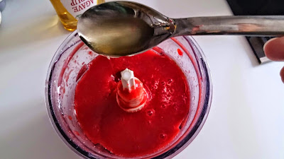 Mixez 200 gr de fraises avec 2 cuillères à soupe de maïzena et 4 cuillères à soupe de sirop d'agave.