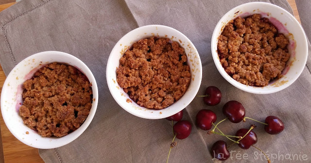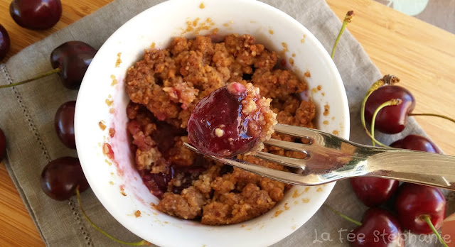Bonjour Stéphanie, j'ai fait ce crumble en utilisant des bananes, des pommes et des poires (pas de cerises sous la main...) et il est divin...La pate déja crue est délicieuse, et cuite c'est juste à tomber. Je vais essayer de la refaire en pate à tarte et en biscuits (ah ah...ca m'a vraiment plu ...). Merci encore de la recette et de ton site. Anabela