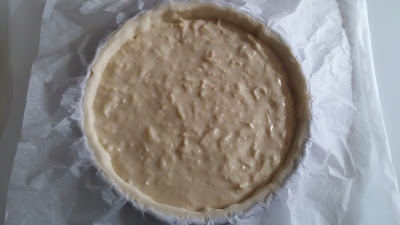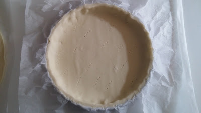 5. Dans un moule à tarte, disposer la première pâte feuilletée. Ôtez l'excédant de pâte en roulant le rouleau à pâtisserie sur les bords du moule et piquer le fond de votre tarte avec une fourchette.