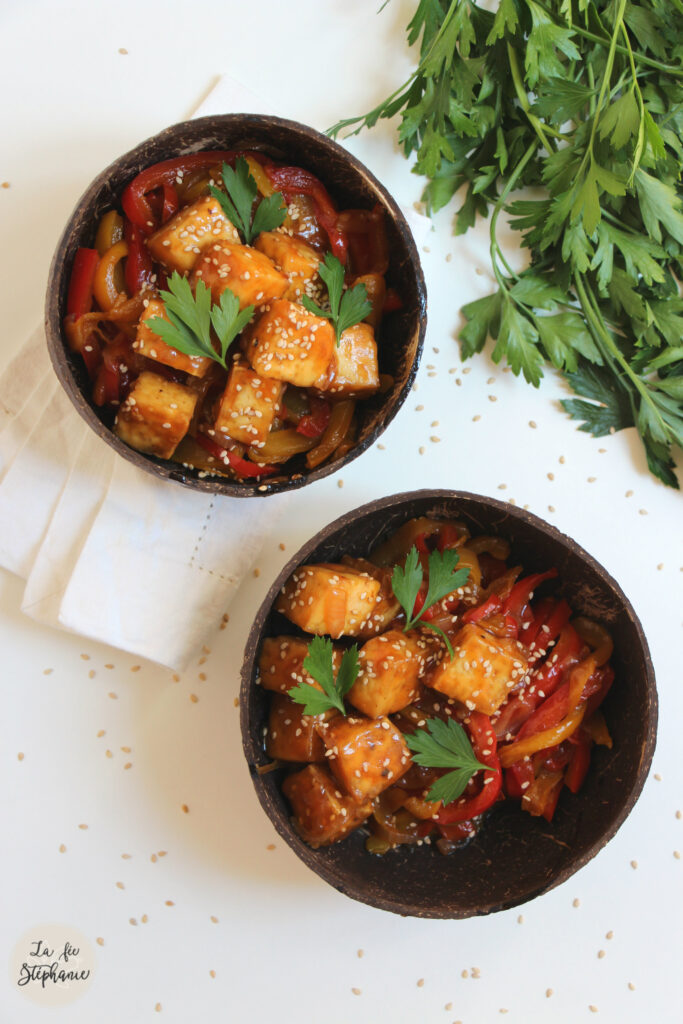 Ce week-end, nous avions le choix entre passer 3 heures dans les bouchons pour aller passer la journée à la plage, ou rester tranquilles à la maison. On a opté pour la deuxième solution, moins rigolote certes, mais plus reposante et moins stressante. Du coup, j’ai pu vous mijoter une petite recette sympa à base de poivrons caramélisés et de tofu croustillant avec sa petite sauce, c’était trop trop bon!!