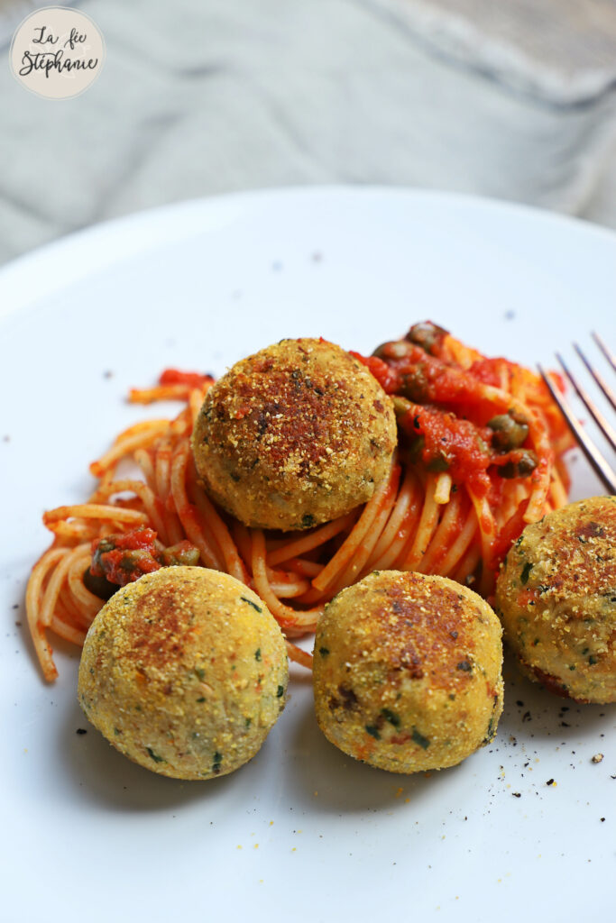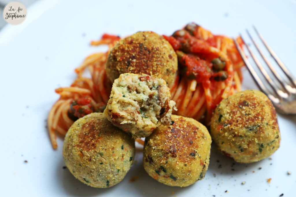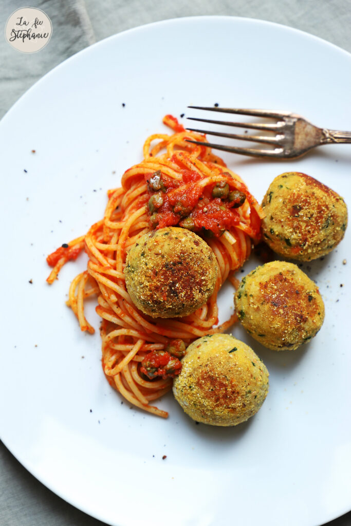 J’ai préparé mes boulettes avec des spaghetti aux câpres, elles peuvent aussi s’accompagner d’une salade ou de légumes poêlés et sont parfaites dans un bouddha bowl!