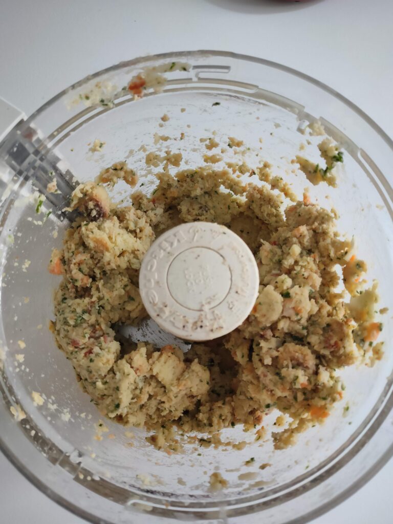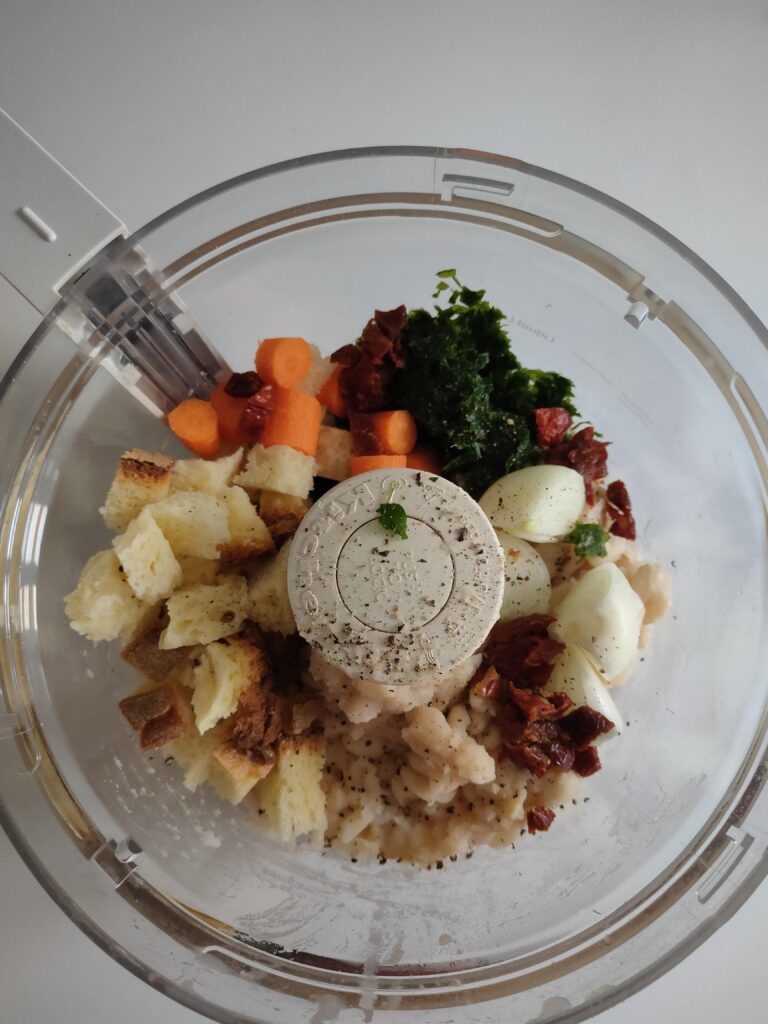 5. Verser dans le mixeur les haricots blancs avec le reste des ingrédients (sauf la chapelure qui servira à paner les boulettes) . Saler et poivrer selon les goûts. Mixer jusqu’à obtention d’une farce homogène.