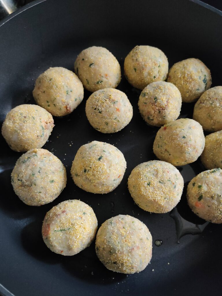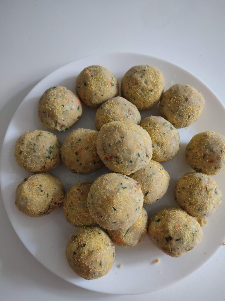 6. Façonner des boulettes avec les mains. Les rouler dans un peu de chapelure ou de farine de maïs.