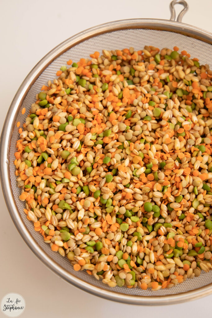 1. Bien rincer l’orge et les légumineuses. Le trempage n’est pas nécessaire.
