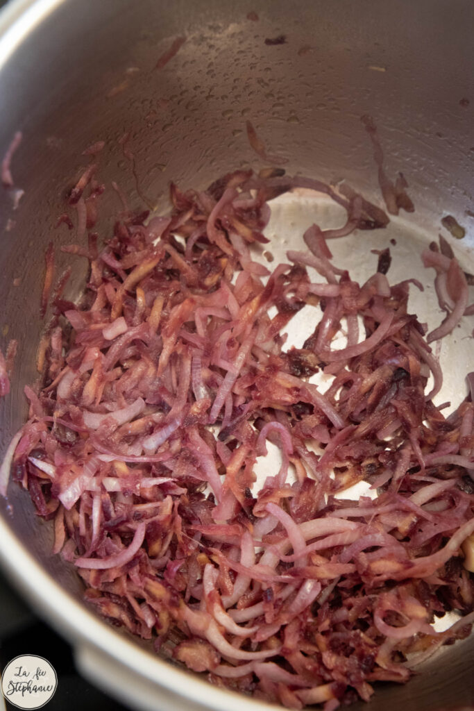 2. Faire revenir l’oignon émincé, la gousse d’ail et la carotte râpée dans une grande casserole ou un autocuiseur.