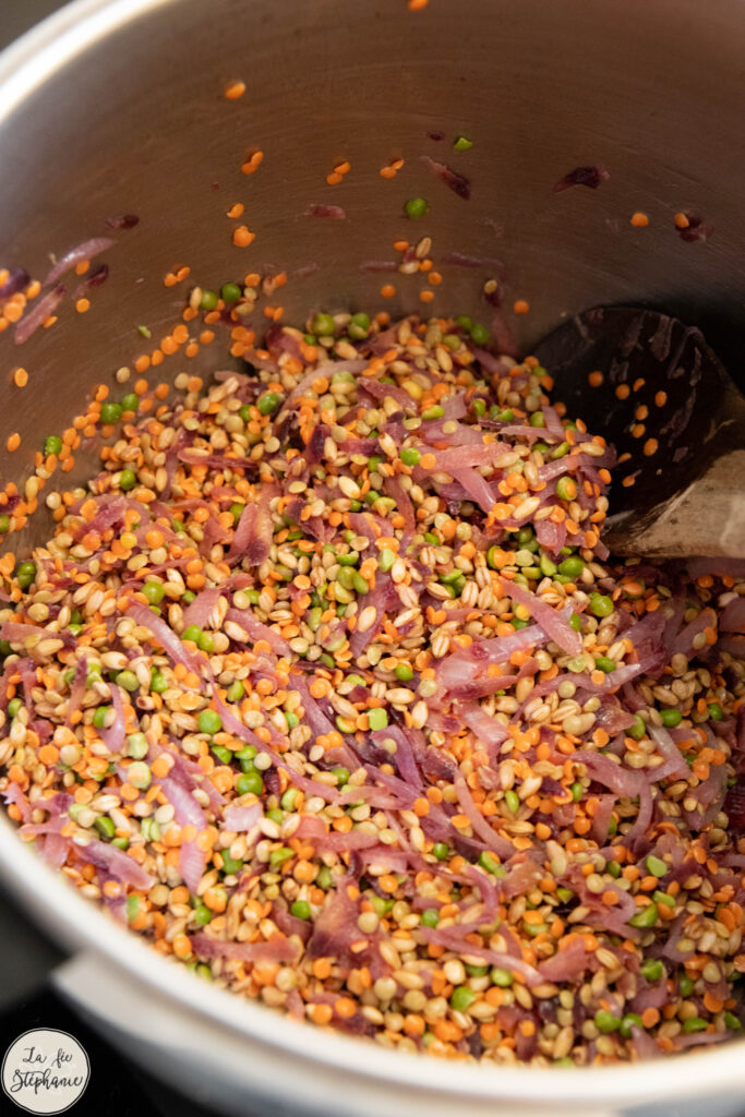 Après les excès du week-end, on se remet dans le droit chemin!! J’avais cuisiné pas mal de choses ces derniers jours et aujourd’hui une énorme paresse l’a remporté. Je n’avais pas envie de cuisiner, et oui ça arrive aussi! N’allez pas imaginer que c’est le restau tous les jours, je suis une vraie dame tartines le soir notamment ou je ne cuisine pratiquement pas. Sauf le week-end ou on adore les soirées pizzas ou sushis, on est plutôt plateau télé avec des petites choses à grignoter qui ne prennent pas plus de 5 minutes de préparation et encore! Quand je ne sais pas quoi faire pour le déjeuner ou pas envie de cuisiner, c’est sauce tomate ou lentilles et aujourd’hui c’était au tour des lentilles! Mon plat était prêt rapidement, l’autocuiseur est d’une grande utilité dans ces moments là!! J’ai fait un petit mélange avec les fonds de placard en utilisant des ingrédients ne nécessitant pas de trempage au préalable: orge, petits pois, lentilles vertes et corail. C’était vraiment délicieux, comme quoi ce n’est pas la peine de passer des heures en cuisine pour bien manger et sainement !