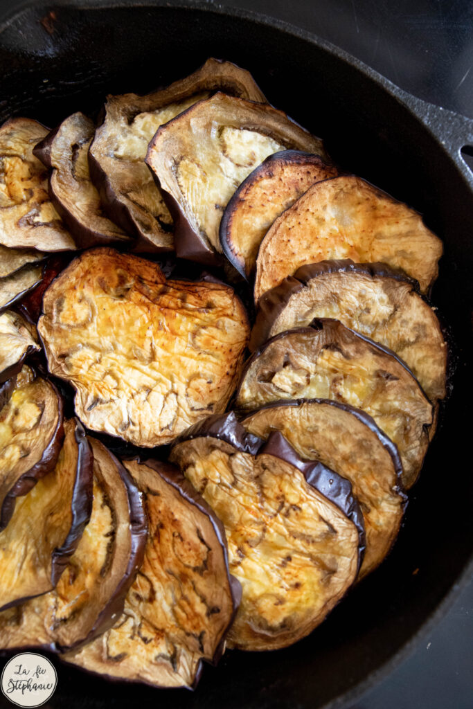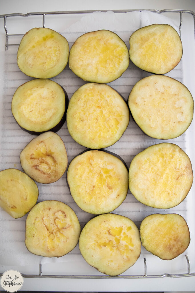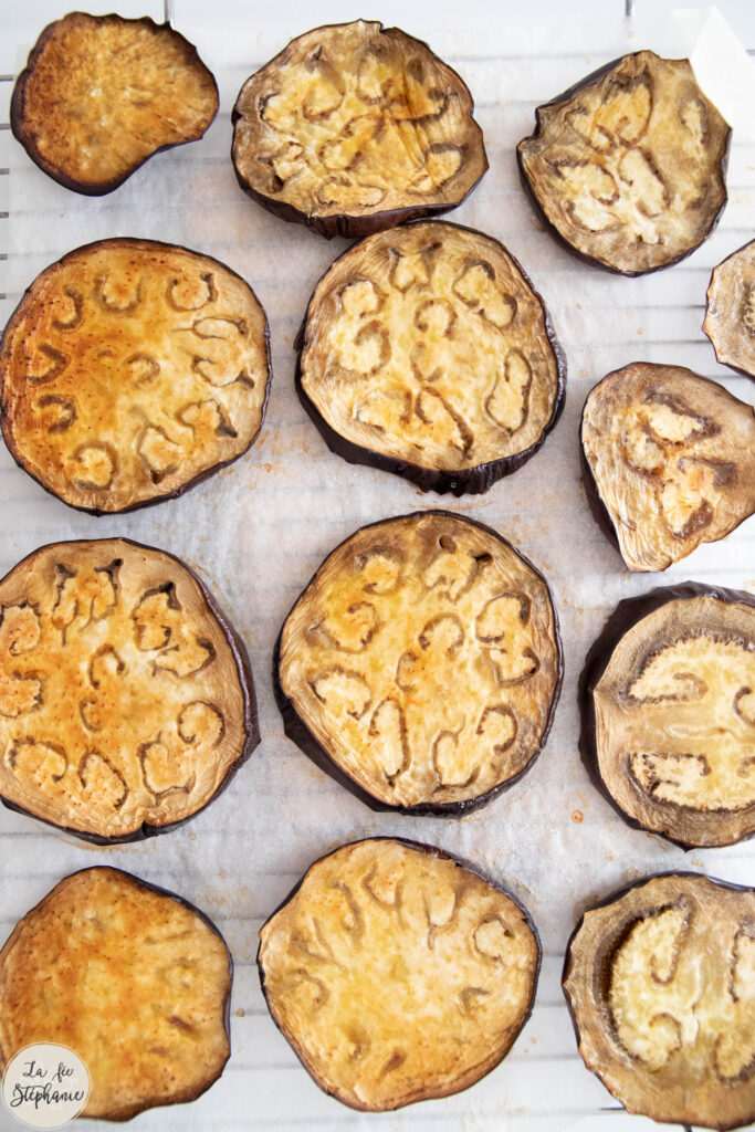 (J’avais 2 plaques dans le four pour 2 grosses aubergines, les temps de cuisson sont plus longs qu’avec plaque seule).