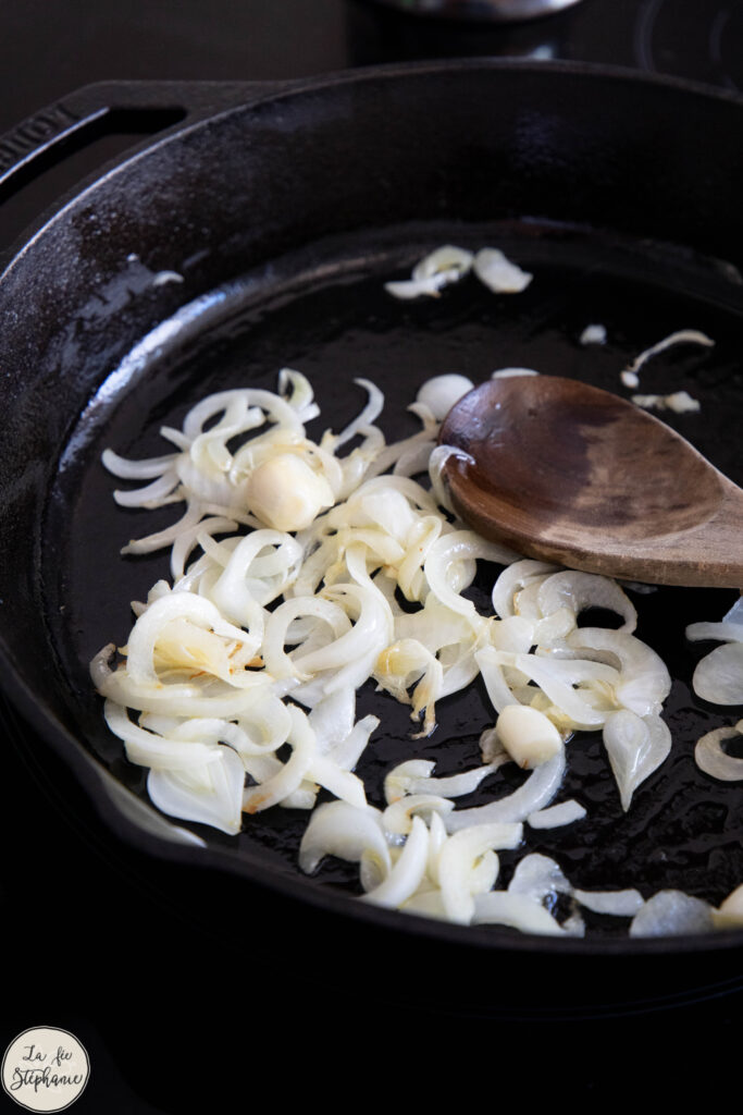 2. Dans une grande poêle (en fonte pour moi), faire revenir l’ail et l’oignon avec 3 c. à s. d’huile d’olive.