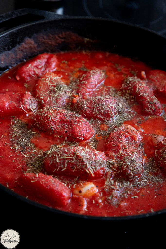 3. Ajouter les tomates pelées. Verser un peu d’eau dans la boite de conserve et mélanger pour récupérer tout le jus. Aromatiser la sauce avec les herbes séchées mélangées. Saler et poivrer. Mélanger quelques minutes, puis écraser les tomates à la fourchette.