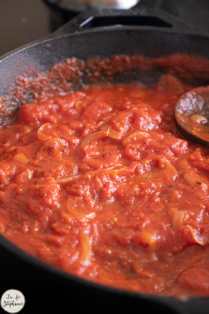 5. Napper le fond d’un plat d’un peu de sauce tomate avec un filet d’huile d’olive.