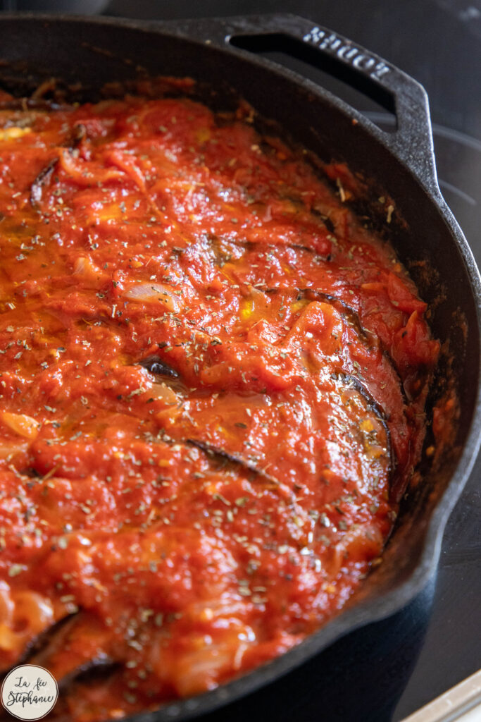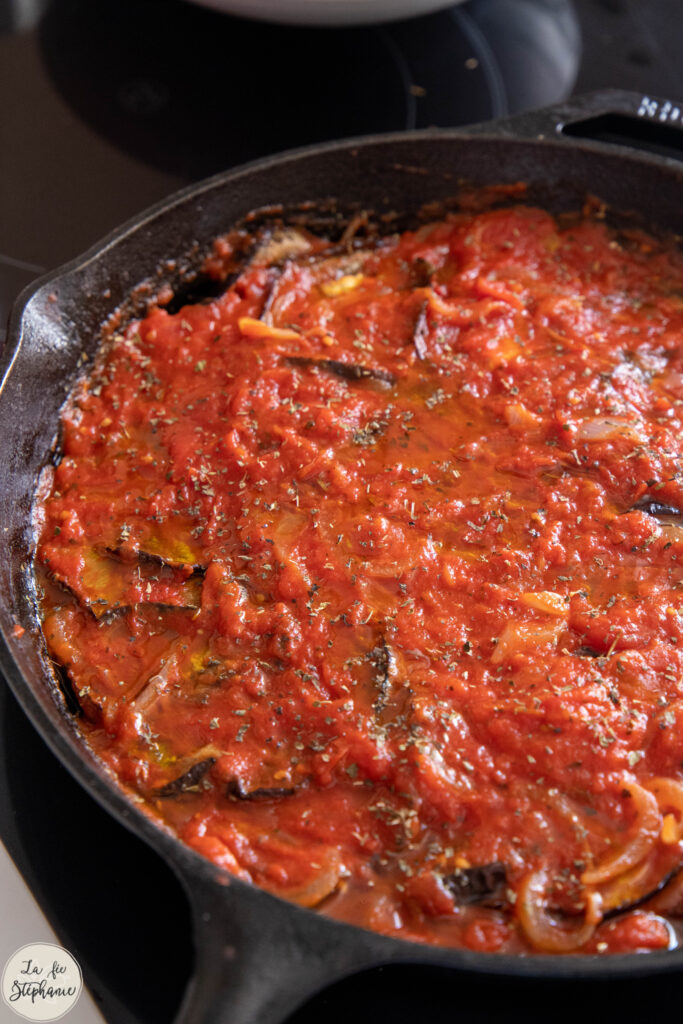 6. Disposer les tranches d’aubergine en cercle, puis couvrir de sauce.