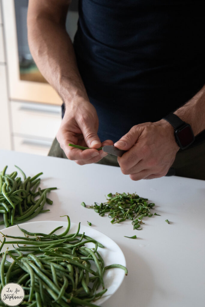 2. Équeuter les haricots verts. Laver et couper en 2 ou en 3 s’ils sont très longs.