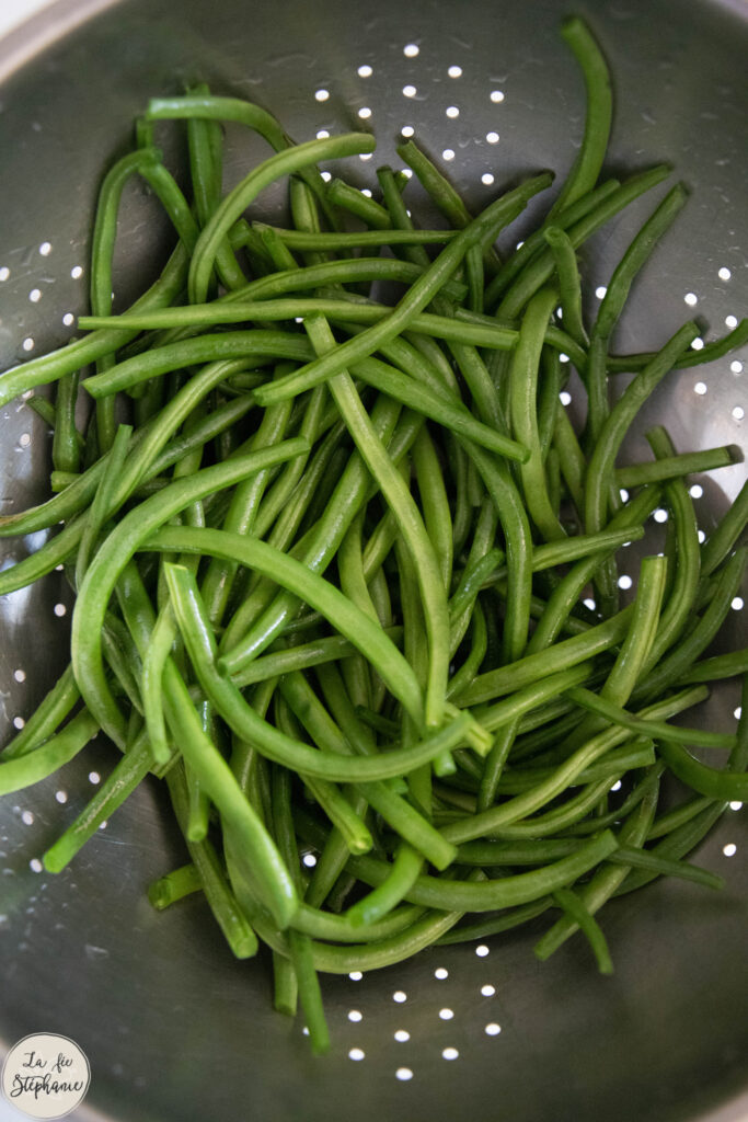 3. Cuire à l’eau 10-15 minutes selon les goûts pour des haricots plus ou moins croquants. Égoutter et plonger immédiatement dans une eau très froide pour stopper la cuisson.