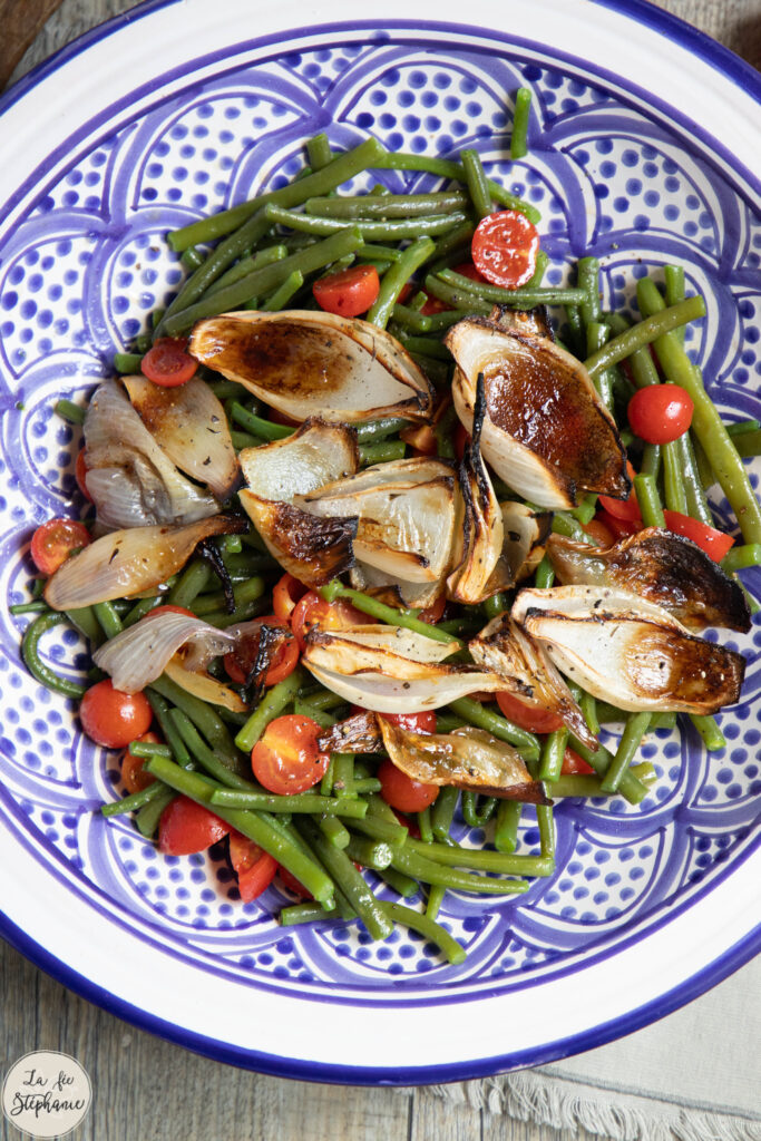Pour la recette du jour, j’ai préparé aujourd’hui une salade de haricots verts, toute simple, mais cerise sur le gâteau, j’y ai mis des oignons rouges rôtis. Ils font toute la différence croyez-moi, c’est délicieux !