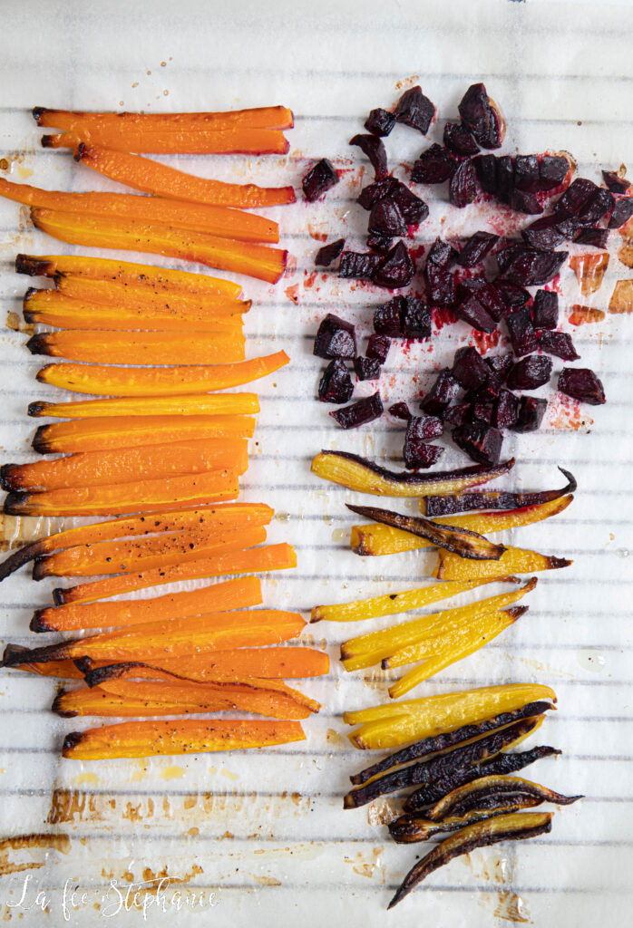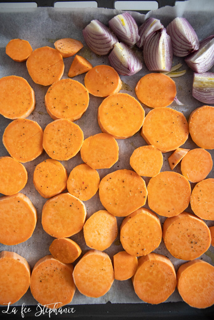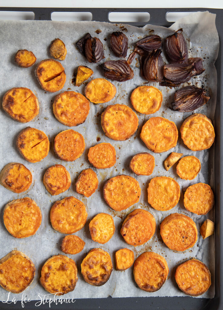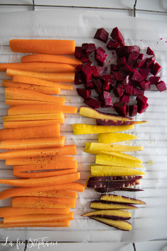 1.Les légumes rôtis: peler patates douces, carottes et betteraves. Couper les patates douces en tranches d’1 cm, les carottes en bâtonnets et les betteraves en dés. Peler les oignons et couper en quartiers.