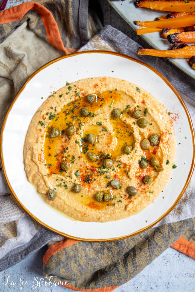 6. Le houmous au paprika: rincer et égoutter les pois chiches en boite. Mixer avec le jus d’1/2 citron, la sauce tahini, le paprika et les graines de cumin. Saler. Commencer à mixer en ajoutant l’eau chaude en filet jusqu’à obtention de la consistance désirée. Transférer le houmous dans un bol. Répartir les câpres, saupoudrer d’un peu de paprika et de persil. Arroser généreusement d’huile d’olive.