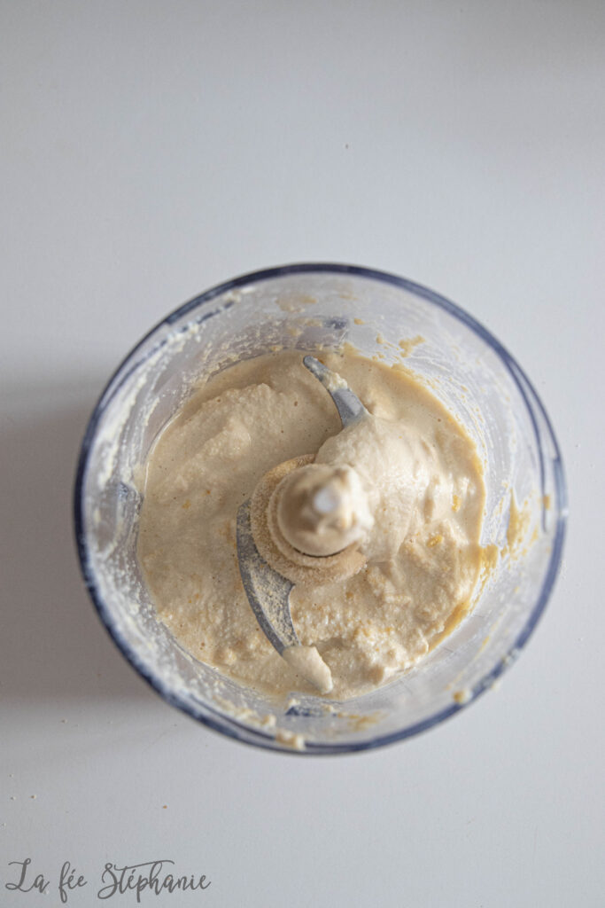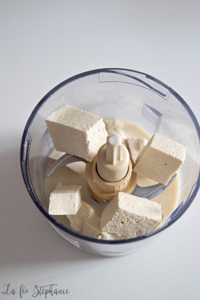 1.Égoutter et couper le tofu en morceaux. Verser dans le mixeur avec le lait végétal et commencer à mixer jusqu’à obtention d’une pâte assez épaisse.
