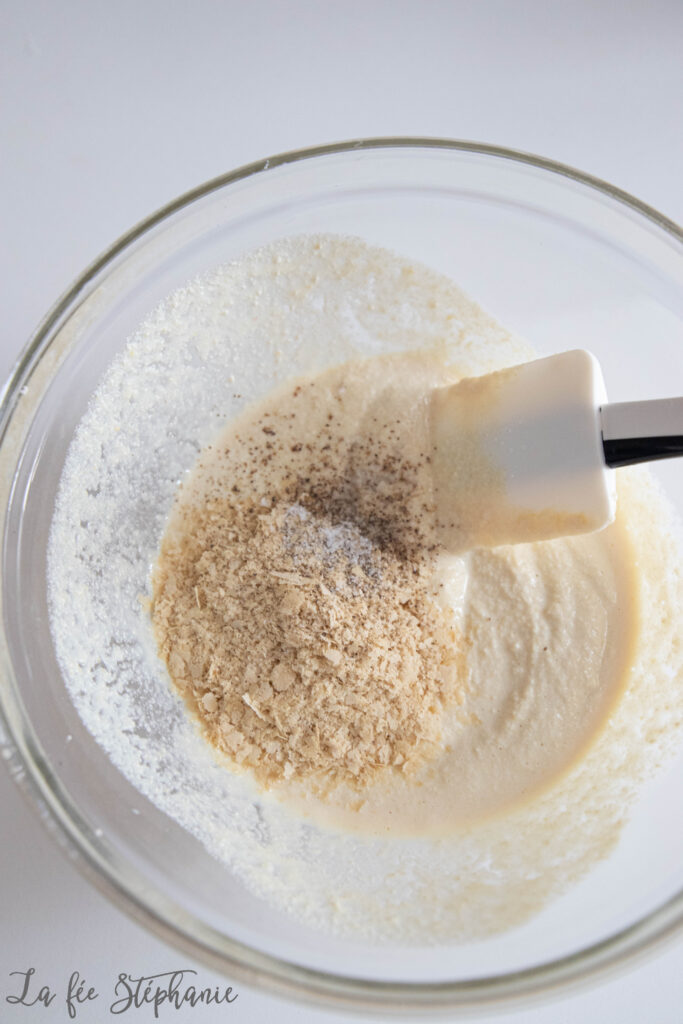 Verser la préparation obtenue dans un saladier et mélanger avec la farine de pois chiche, la levure maltée et l'huile d'olive.