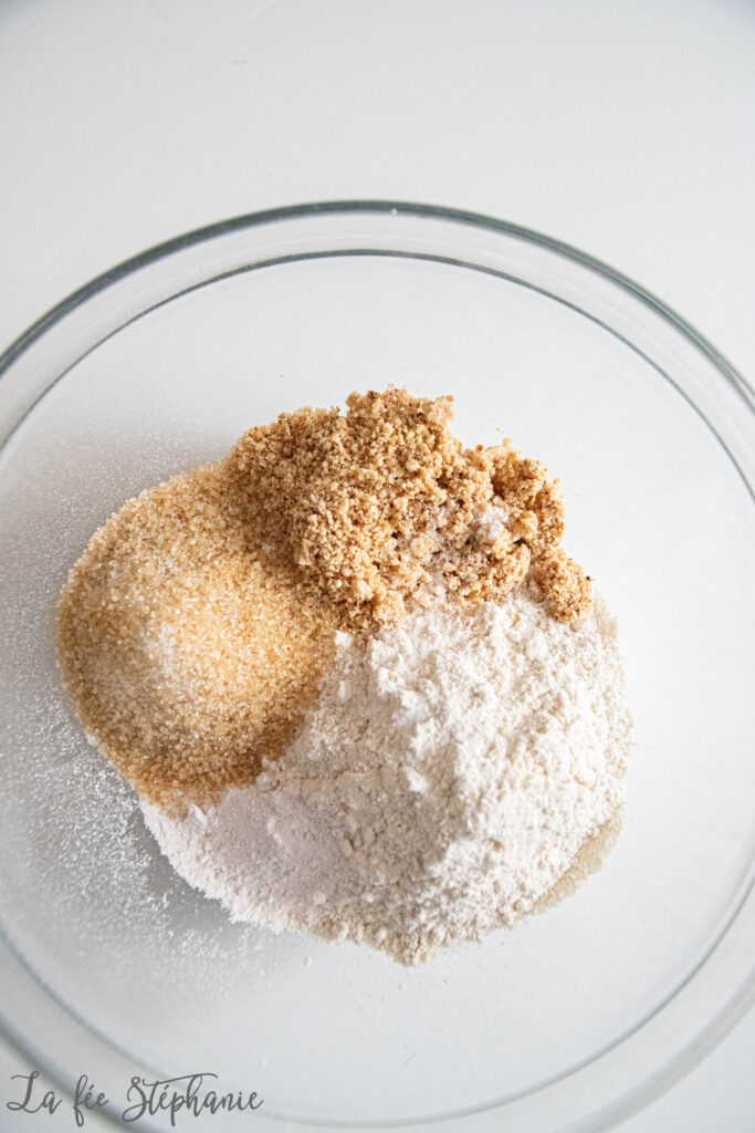 1.Préchauffer le four à 180°C. Mixer les noisettes en une fine poudre. Transférer dans un saladier avec le reste des ingrédients secs.
