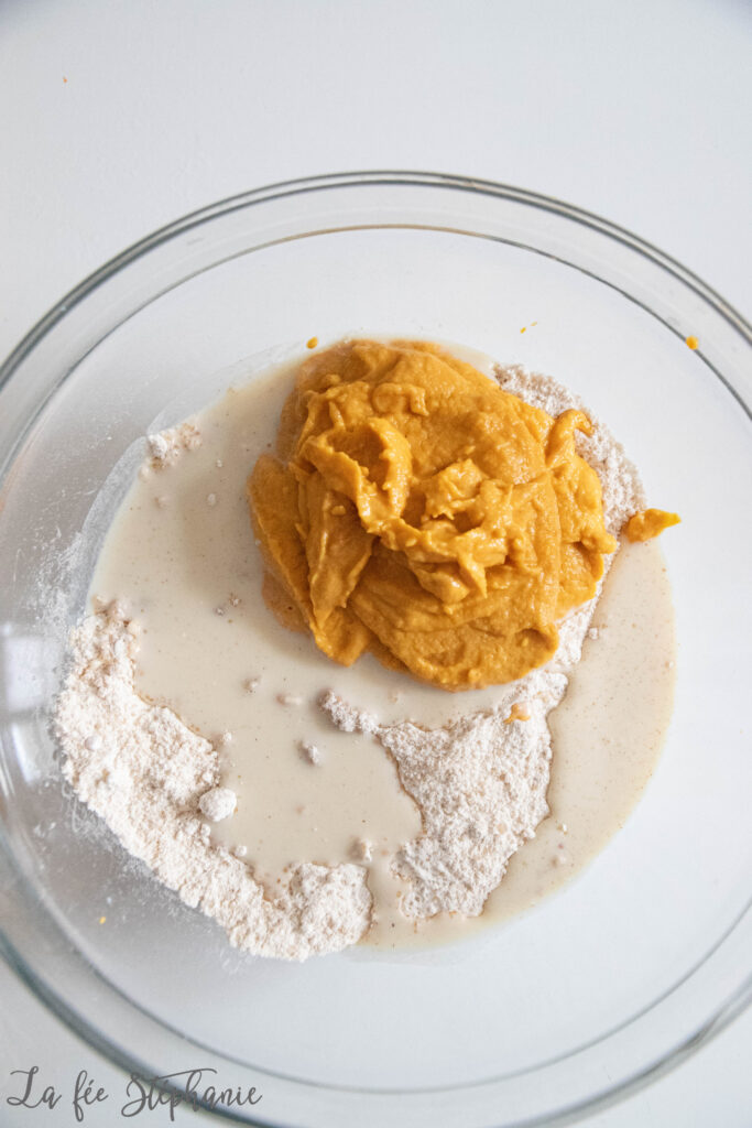 2.Mixer la purée de courge avec la purée d’arachide. Verser sur les ingrédients secs avec le lait et mélanger rapidement en une farce homogène.