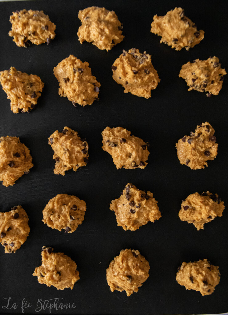 4.Former les biscuits à l’aide de deux cuillères, les disposer côte à côte sur une plaque de four. Enfourner pour 20 minutes.