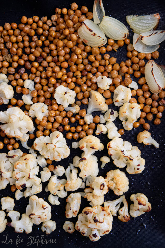 2. Rincer et égoutter les pois chiches. Disposer sur une plaque de cuisson avec les fleurettes et un oignon pelé coupé en quartiers. Arroser le tout d’huile d’olive et enfourner 20-25 minutes à 200°C. Les pois chiches doivent être bien croquants.