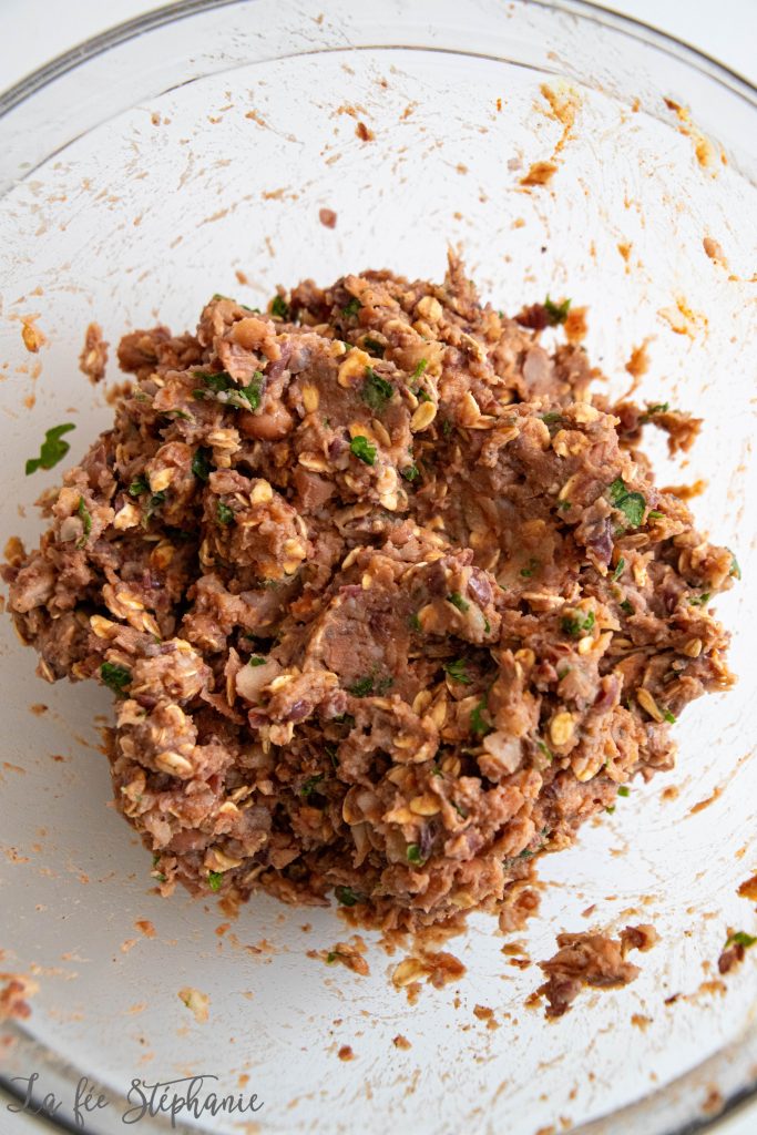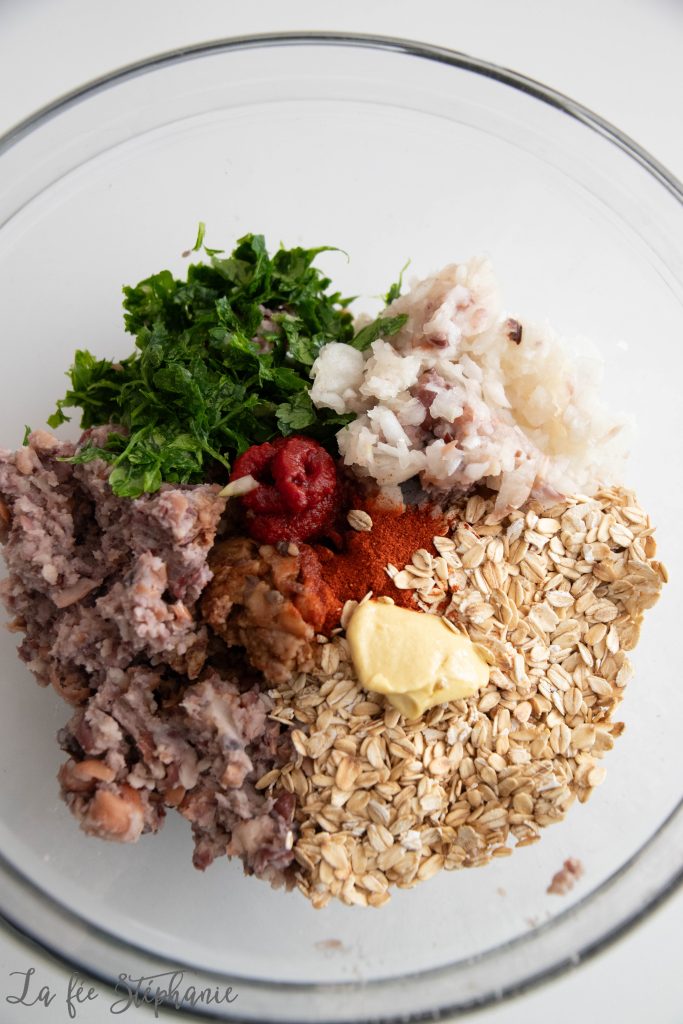 3.Mixer finement un oignon. Ciseler finement le persil. Ajouter avec les haricots et bien mélanger avec les flocons d’avoine, le concentré de tomates, la sauce soja, la moutarde, le paprika, sel et poivre.