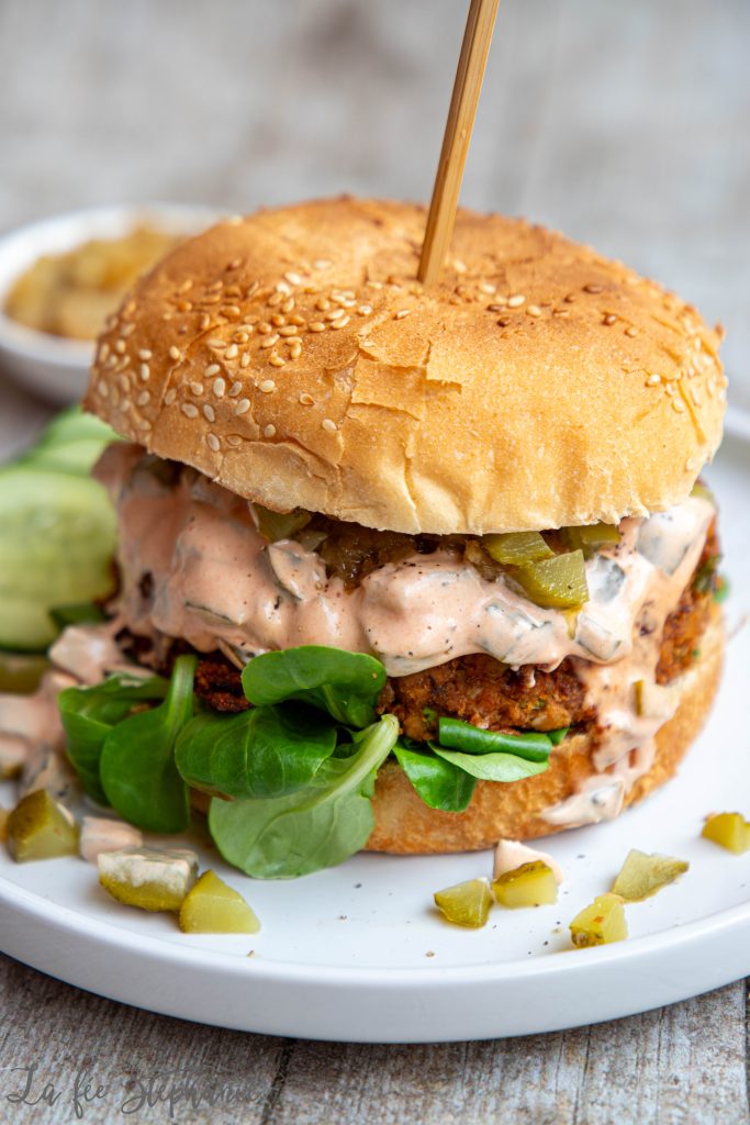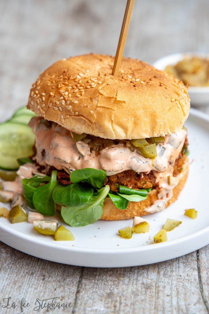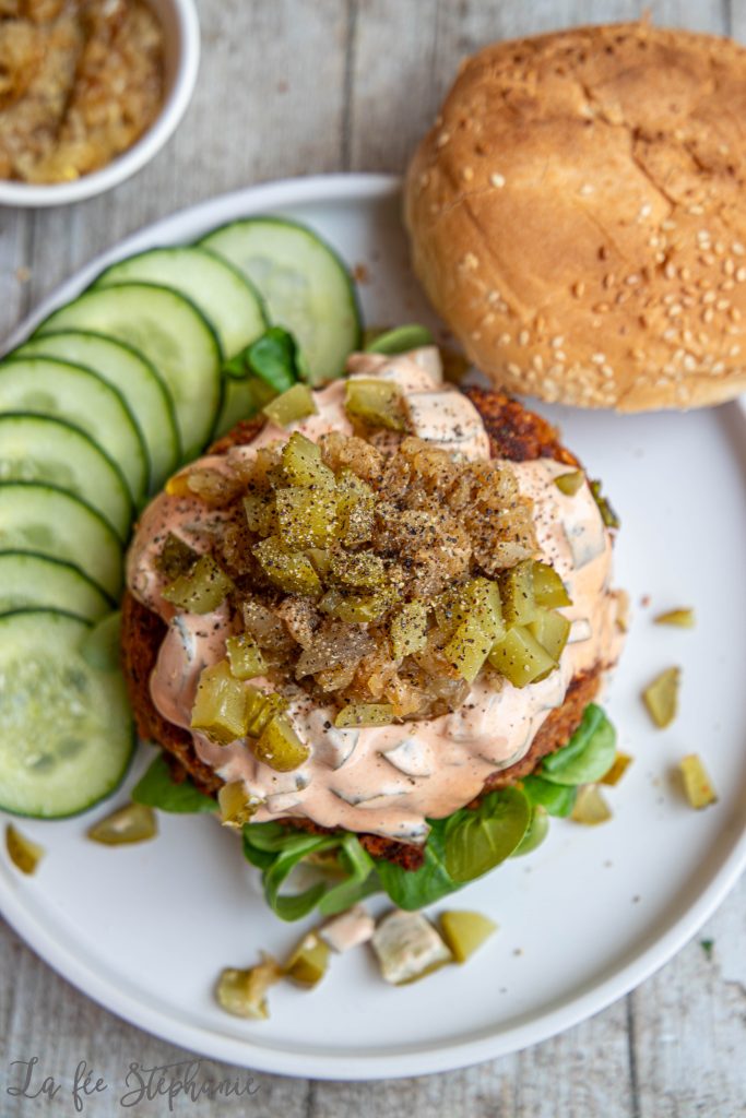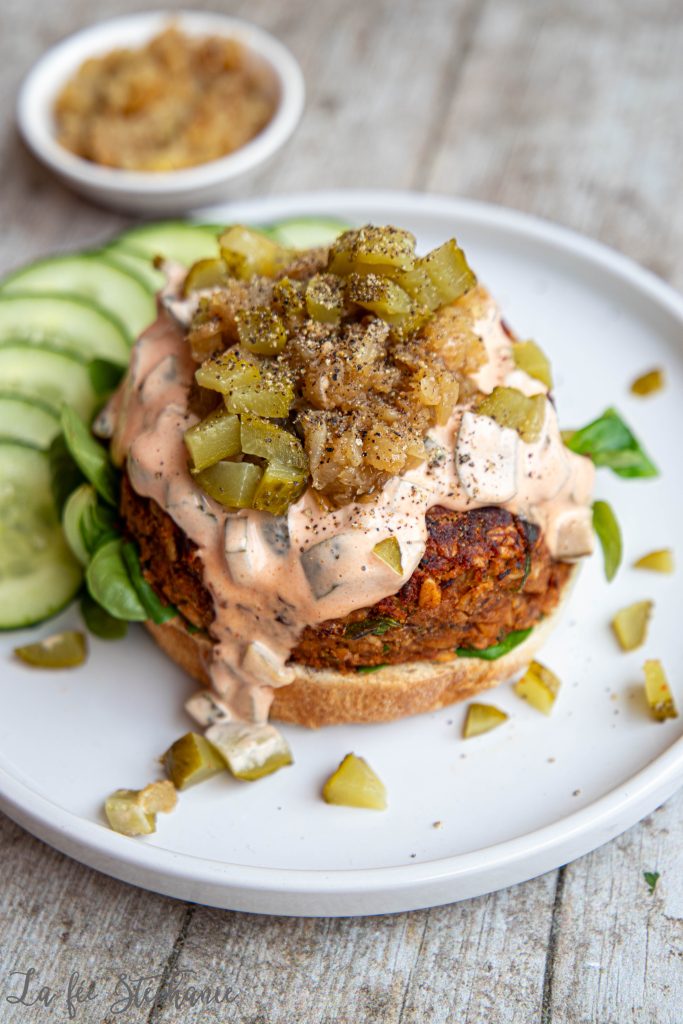 Je sais, je sais, il y a déjà différentes recettes de burgers sur le blog, mais que voulez-vous, on adore ça et j’en fais assez souvent. Je partage mon quotidien culinaire avec vous, donc certaines recettes reviennent parfois. Ne cuisinant pas de viande, il faut bien nourrir les deux ados affamés et heureusement pour moi, ils adorent les légumineuses et surtout sous forme de burger. C’est un repas vraiment complet, rassasiant, gourmand et nutritif. Je mélange souvent une céréale comme du riz cuit à ma farce pour que les burgers aient moins cet effet purée avec plus de texture, mais les mangeant dans des petits pains, je trouve que riz et pain ne sont pas forcément nécessaires. On double donc les proportions de légumineuses et la texture ne manque pas si on y ajoute de la salade ou des légumes crus et bien croquants. Pour un burger encore plus gourmand, j’ai préparé des oignons caramélisés et une sauce rose aux cornichons. Un régal ! C’est un petit plus que vous n’êtes pas obligé de préparer, des petits oignons nouveaux et votre sauce référée fera très bien l’affaire.