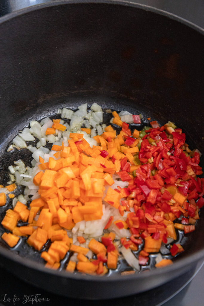 1.Chauffer et huiler une cocotte en fonte ou un faitout à fond épais. Couper oignon, carotte et poivron en fins petits dés et hacher l’ail.