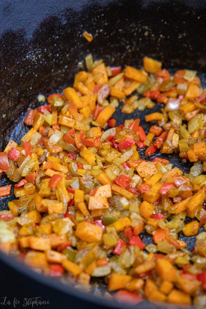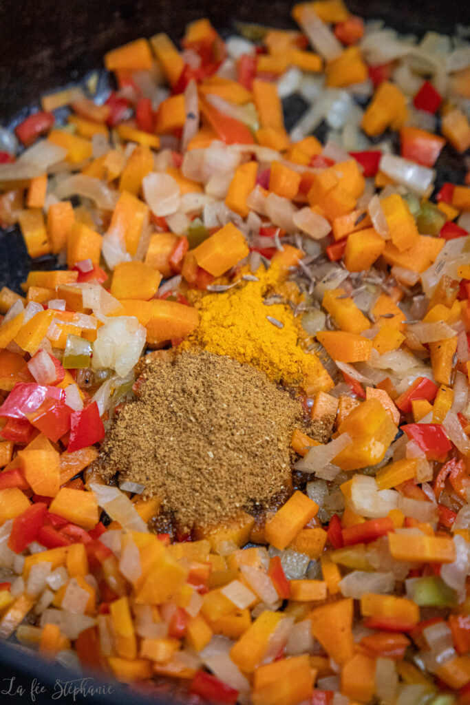 J’ai profité des derniers poivrons de la saison, qui se marient à merveille avec la courge. Mais si vous n’en trouvez plus, pas de panique ! Remplacez-les par un poireau, quelques fleurettes de chou-fleur ou même des dés de pommes de terre ou de patate douce.