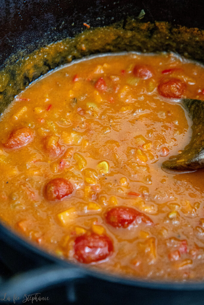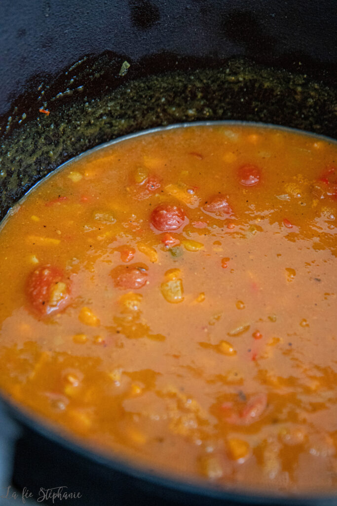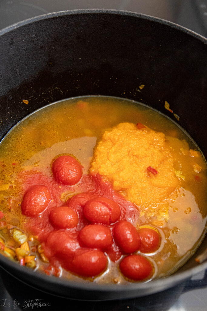 4.Insérer la purée de courge, les tomates et le bouillon de légumes. Porter à légère ébullition, saler et poivrer selon les goûts. Laisser mijoter 15 minutes. La préparation doit un peu s’épaissir.