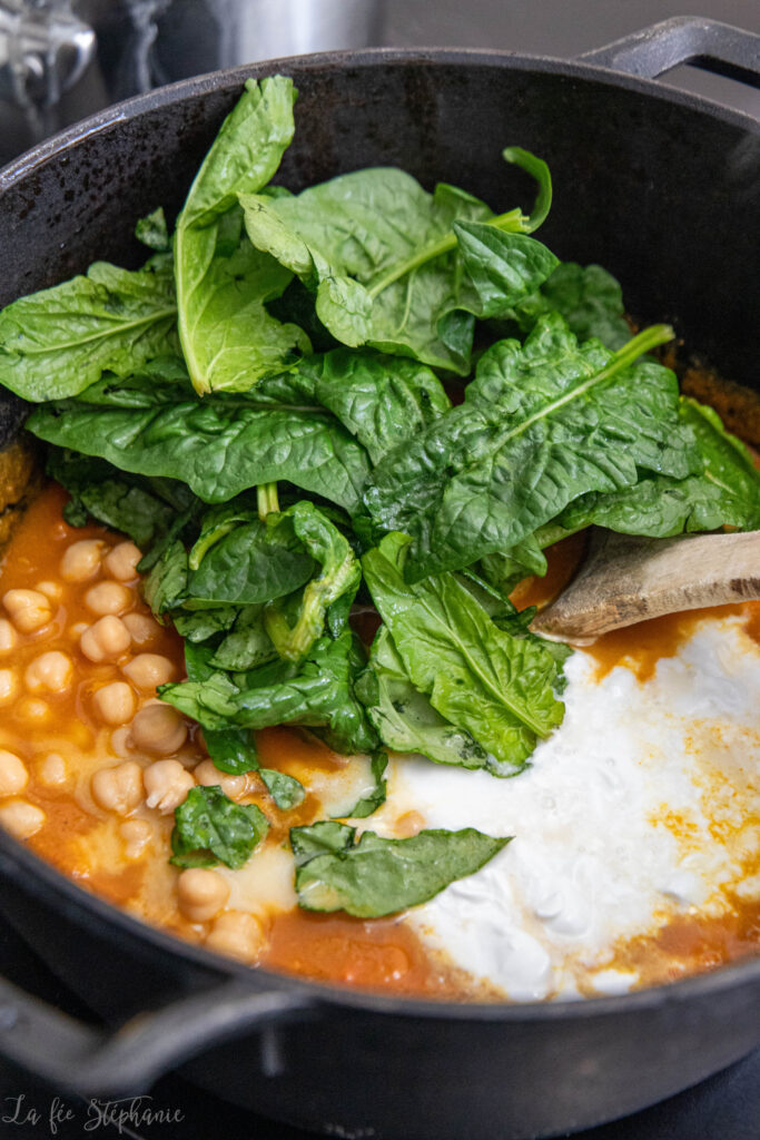 5. Ajouter enfin le lait de coco, les pois chiches rincés et égouttés et les épinards. Laisser sur un feu doux jusqu’à ce que les épinards aient perdus de leur volume et soient tendres.