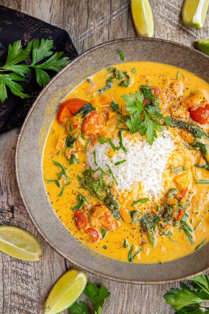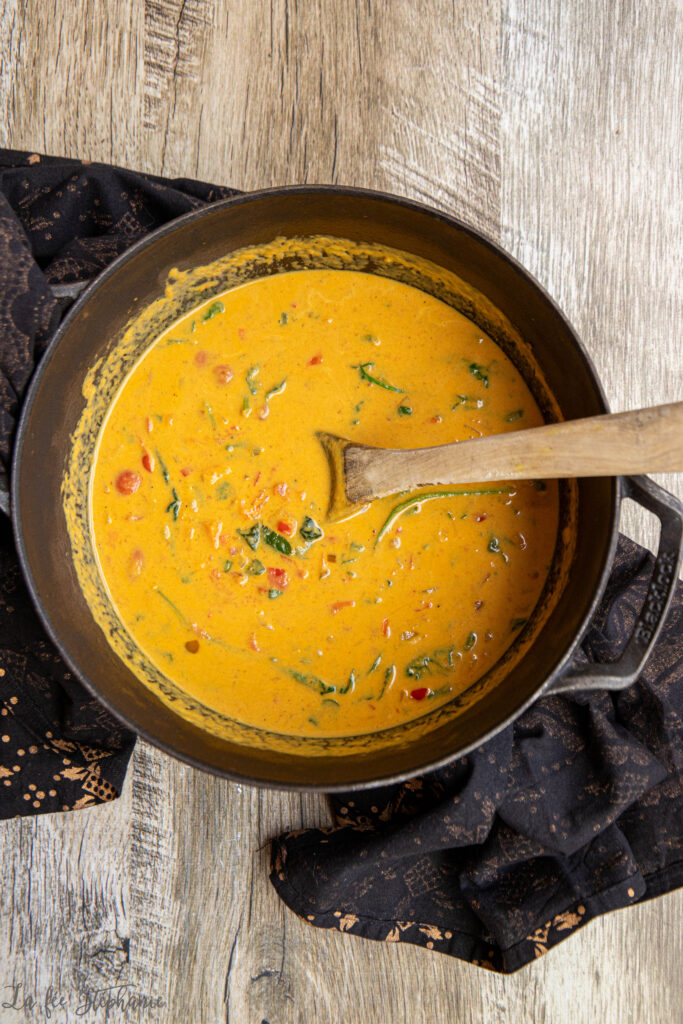 Je n’avais pas de lait de coco, ni de crème mais cela n’a rien enlevé au plat. Bravo et merci