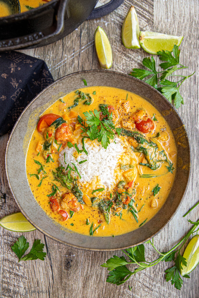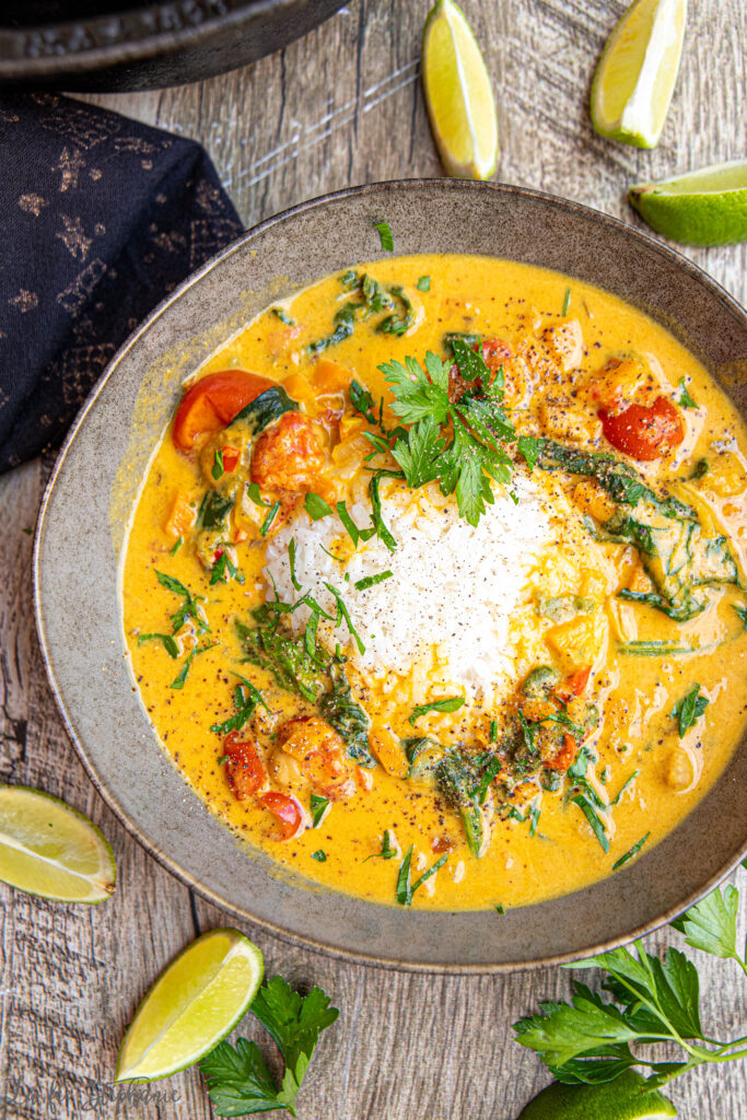 Aujourd’hui, nous nous sommes réchauffés avec un plat de légumes mijotés dans une cocotte, parfumés aux épices et au lait de coco : un plat doux, réconfortant et plein de saveurs. C’est une recette facile et complète, grâce aux pois chiches qui apportent une belle portion de protéines, et à tous les légumes frais qu’elle contient.