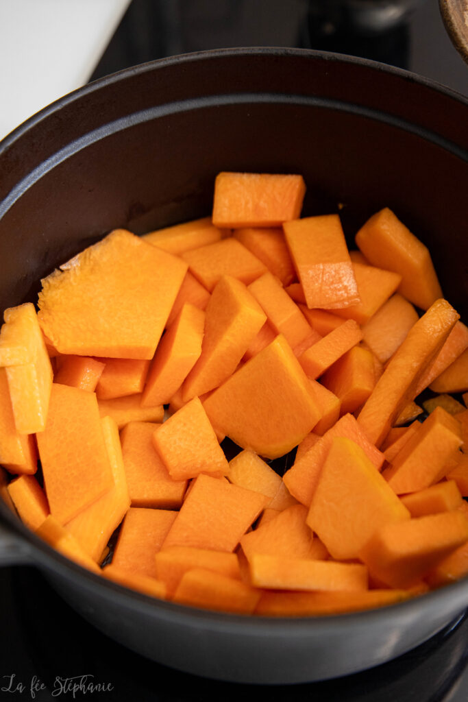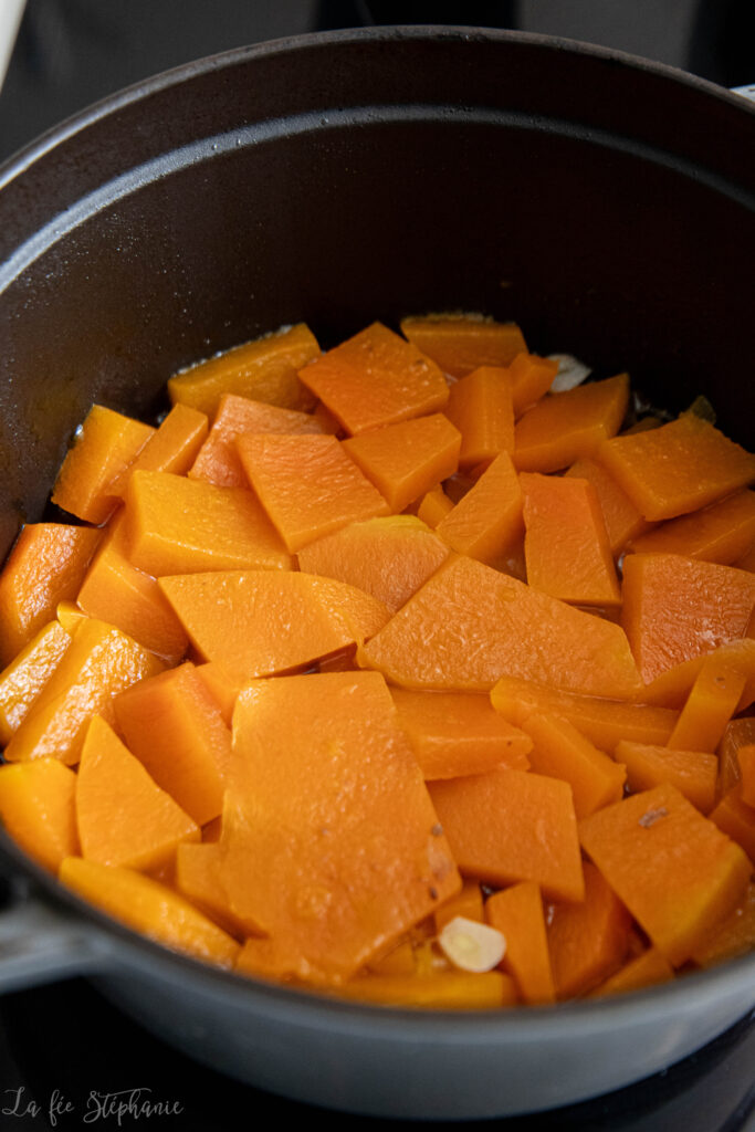 2.Ajouter la courge pelée et épépinée coupée en morceaux. Mélanger 2 minutes.