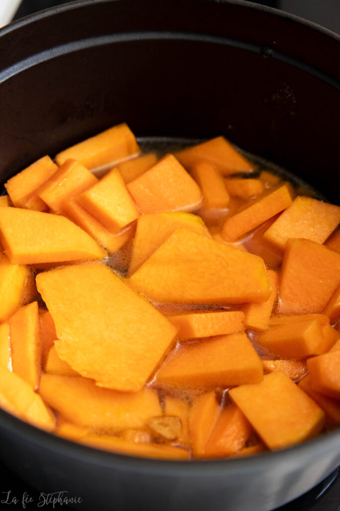 3.Verser 200 ml d’eau salée. Porter à légère ébullition et faire mijoter 20 minutes à feu doux. La courge doit être bien tendre.