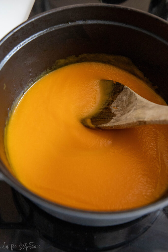4.Mixer la courge avec plus ou moins d’eau de cuisson. On veut obtenir une préparation crémeuse, pas trop liquide. Réserver au chaud dans la cocotte.