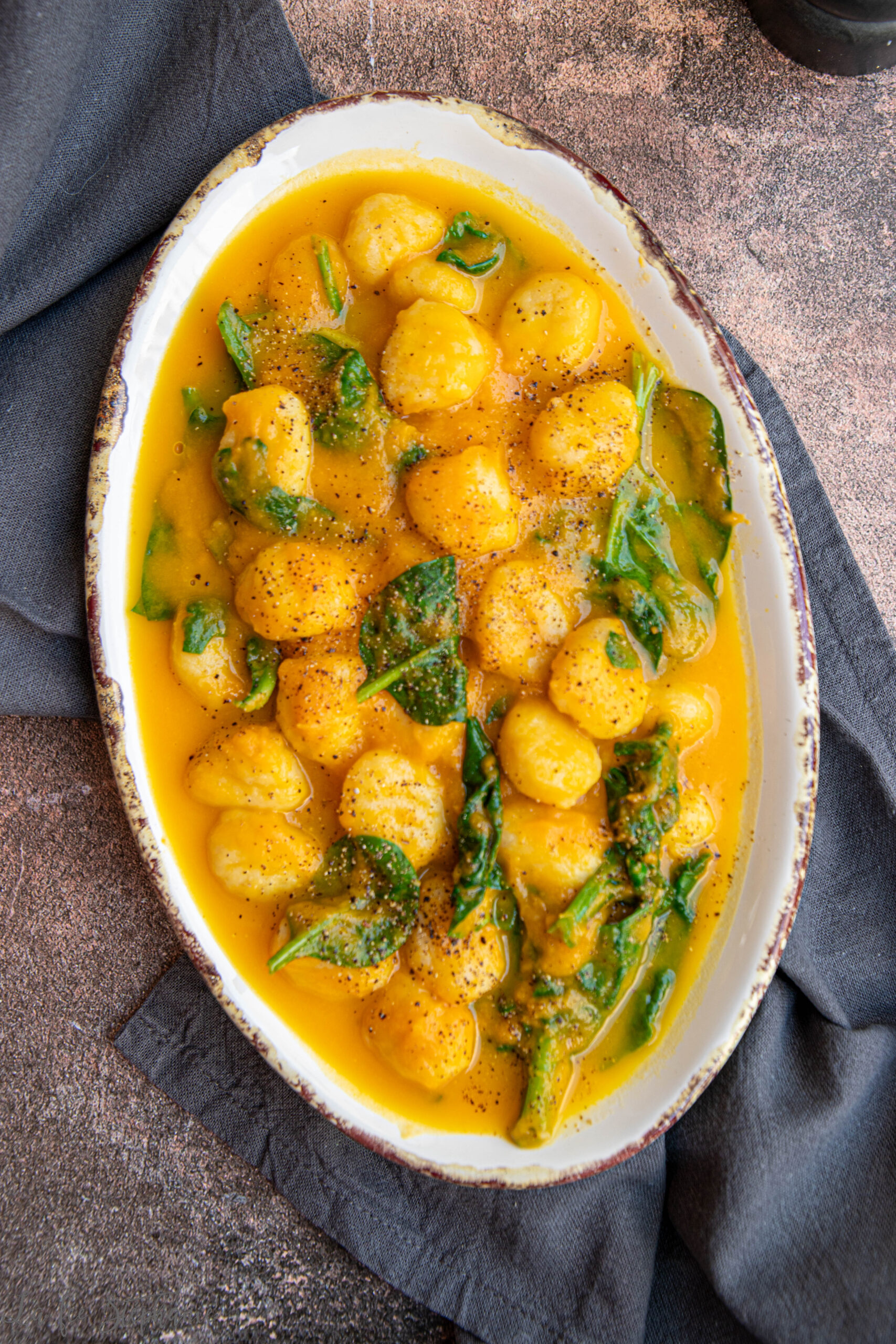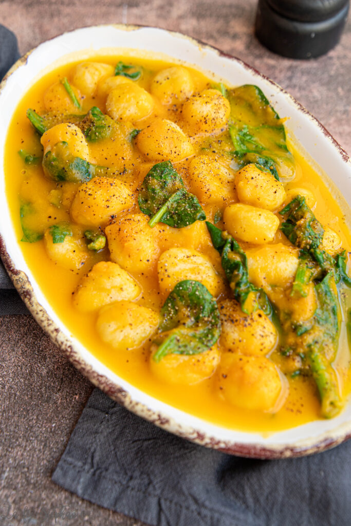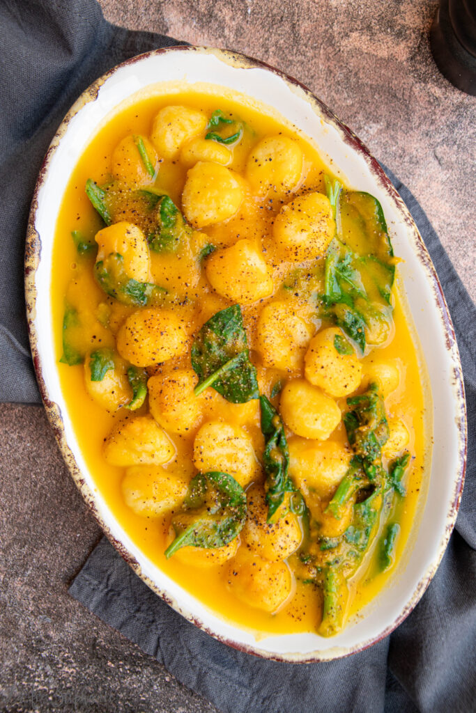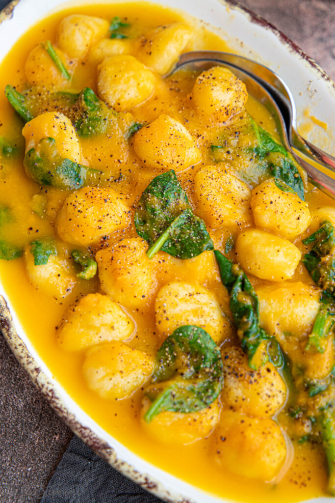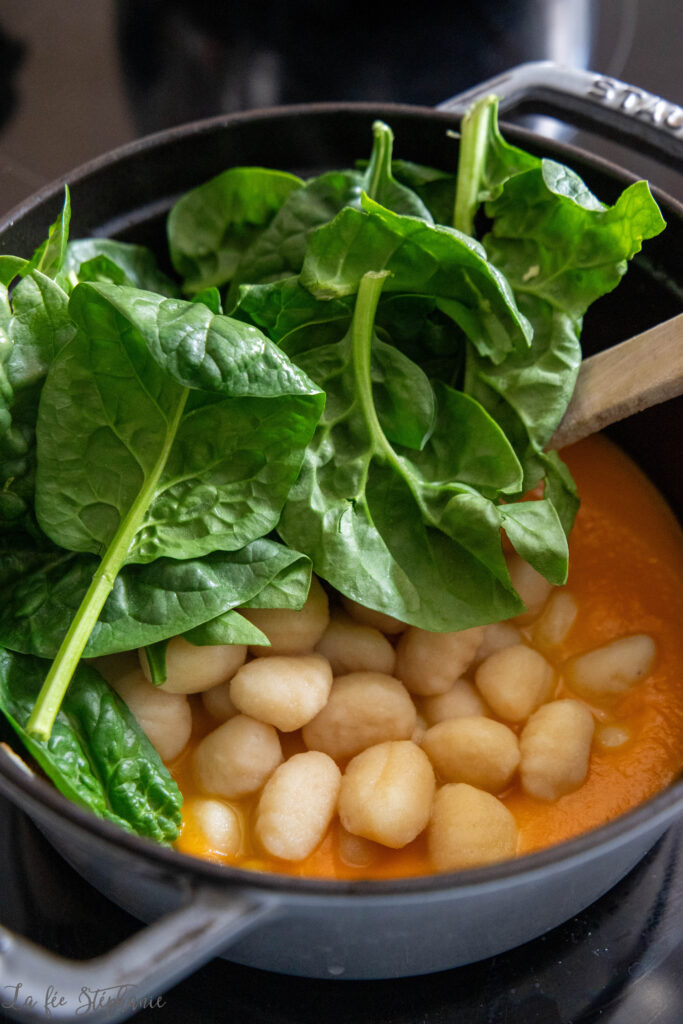 6.Egoutter les gnocchi et mélanger avec la préparation à la courge et avec les épinards. Laisser à feu doux en mélangeant jusqu’à ce que les épinards perdent leur volume.