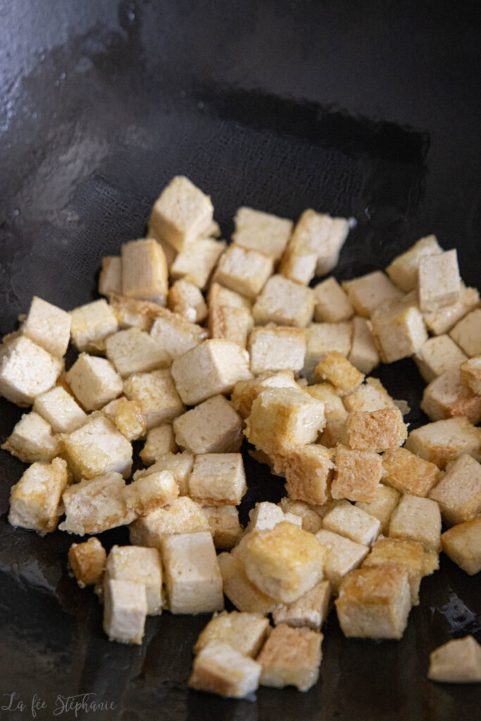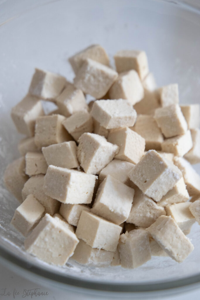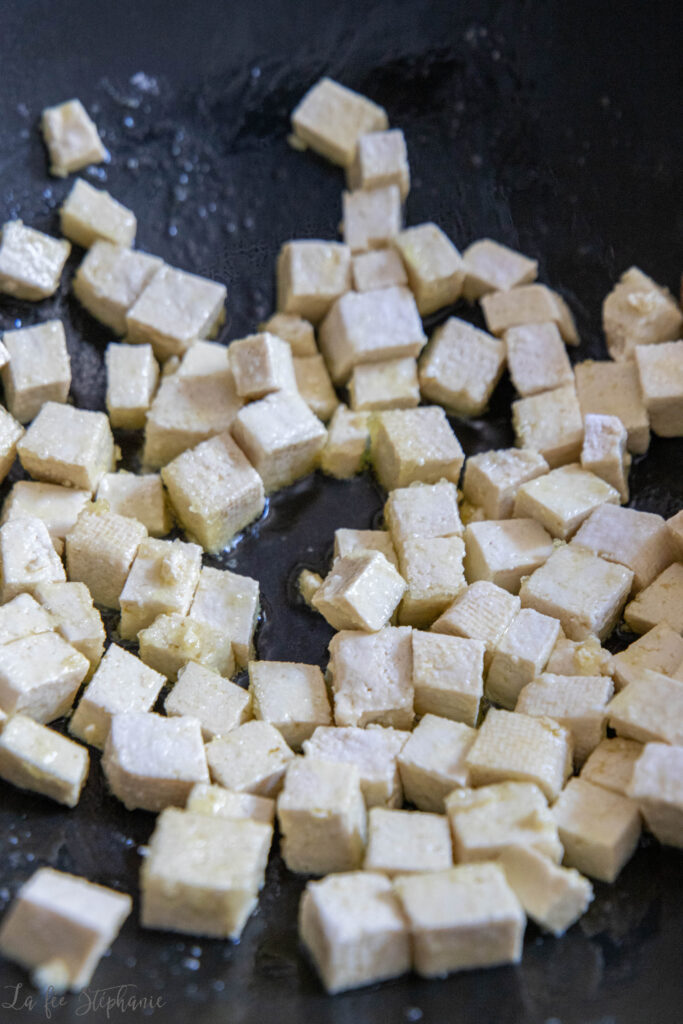 Le couper ensuite en dés. Mélanger avec la fécule. Chauffer et huiler une poêle. Une fois bien chaude, faire dorer les dés de tofu à feu moyen en mélangeant régulièrement pour une cuisson uniforme.