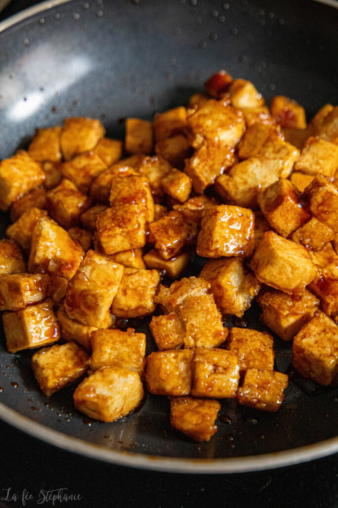3.Arroser le tofu doré de sauce soja, sauce chili ou bbq et de sirop d’agave. Laisser caraméliser 1 minute. Réserver.