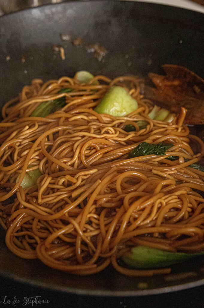 • et pour les nouilles, prenez des nouilles déshydratées ou même des spaghetti: dans ce cas, cuisez-les à l’eau en les retirant à mi-cuisson, puis terminez la cuisson dans le wok avec le bouillon pour qu’elles s’imprègnent bien de la sauce.
