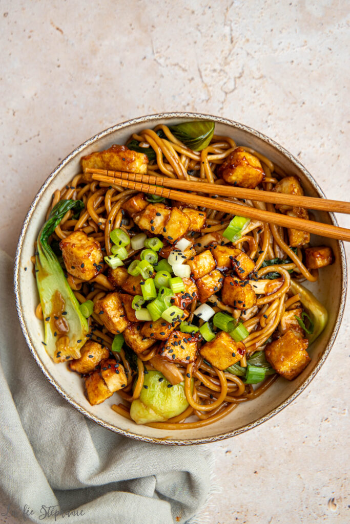 Aujourd’hui, j’ai préparé un plat tout simple mais délicieux : des nouilles sautées au wok avec du chou et des champignons. J’ai commencé par faire sauter les légumes dans un peu d’huile, puis j’ai ajouté du bouillon de légumes et de la sauce soja pour y cuire directement les nouilles fraîches. Avec une cuillère de fécule de maïs (toujours diluée à froid pour éviter les grumeaux), le bouillon s’est transformé en une sauce onctueuse et savoureuse. Et bien sûr, impossible d’oublier le tofu pour compléter le tout avec une belle dose de protéines végétales ! Pensez simplement à le presser avant cuisson pour qu’il perde son eau — sa texture n’en sera que meilleure.