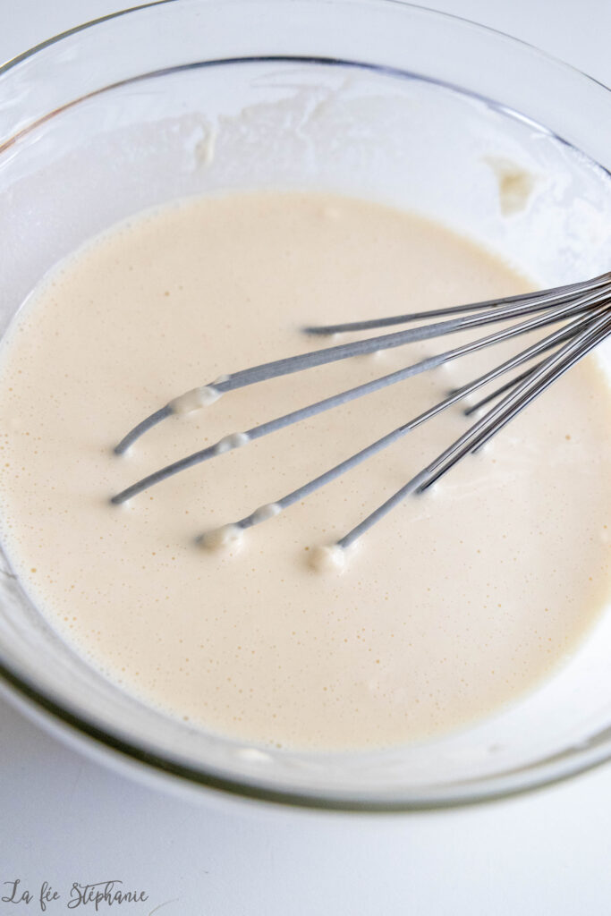 1.Dans un saladier, mélanger au fouet la farine avec l’eau salée. On obtient une sorte de pâte à crêpe.