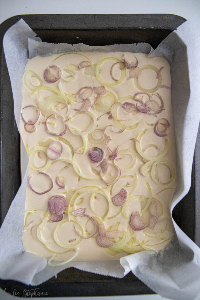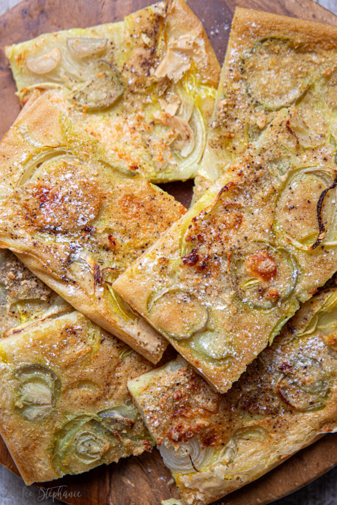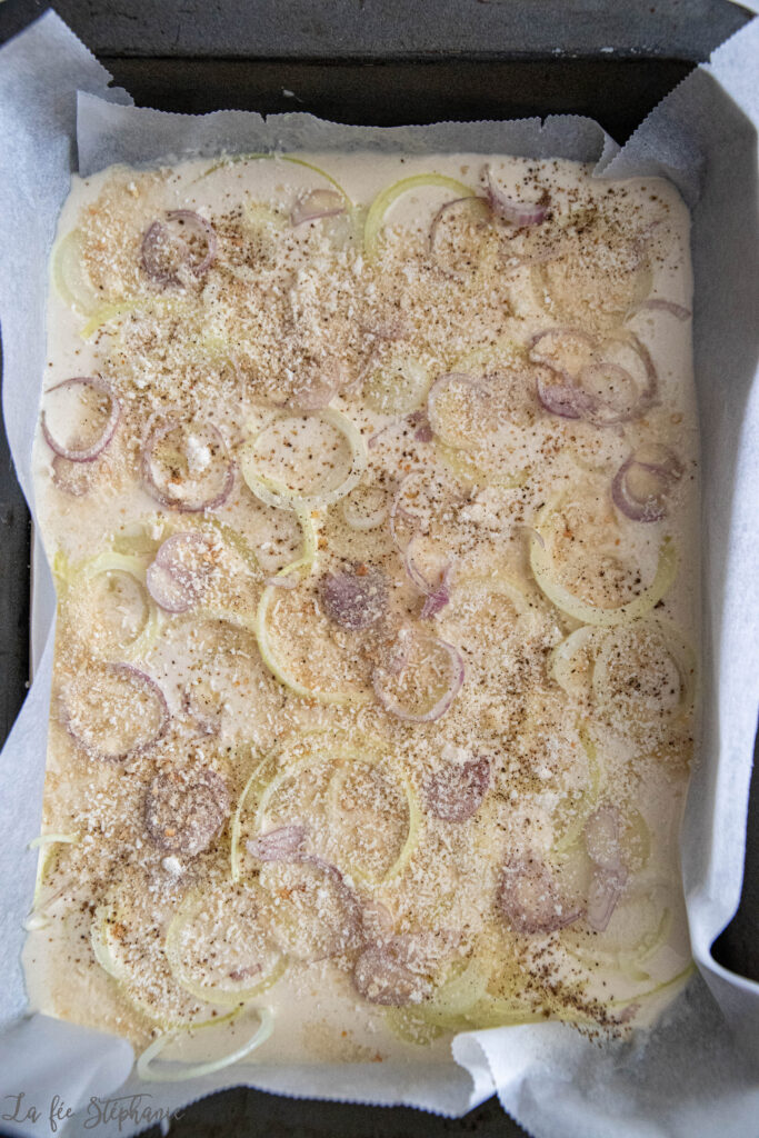 J’ai trouvé quelques oignons… et hop, une schiacciata aux oignons maison ! Pour ceux qui ne connaissent pas, la schiacciata est une spécialité toscane, une sorte de focaccia fine et moelleuse (eau et farine), qu’on garnit souvent d’huile d’olive et de sel (ou, comme ici, d’oignons). C’est simple, rustique et absolument délicieux !