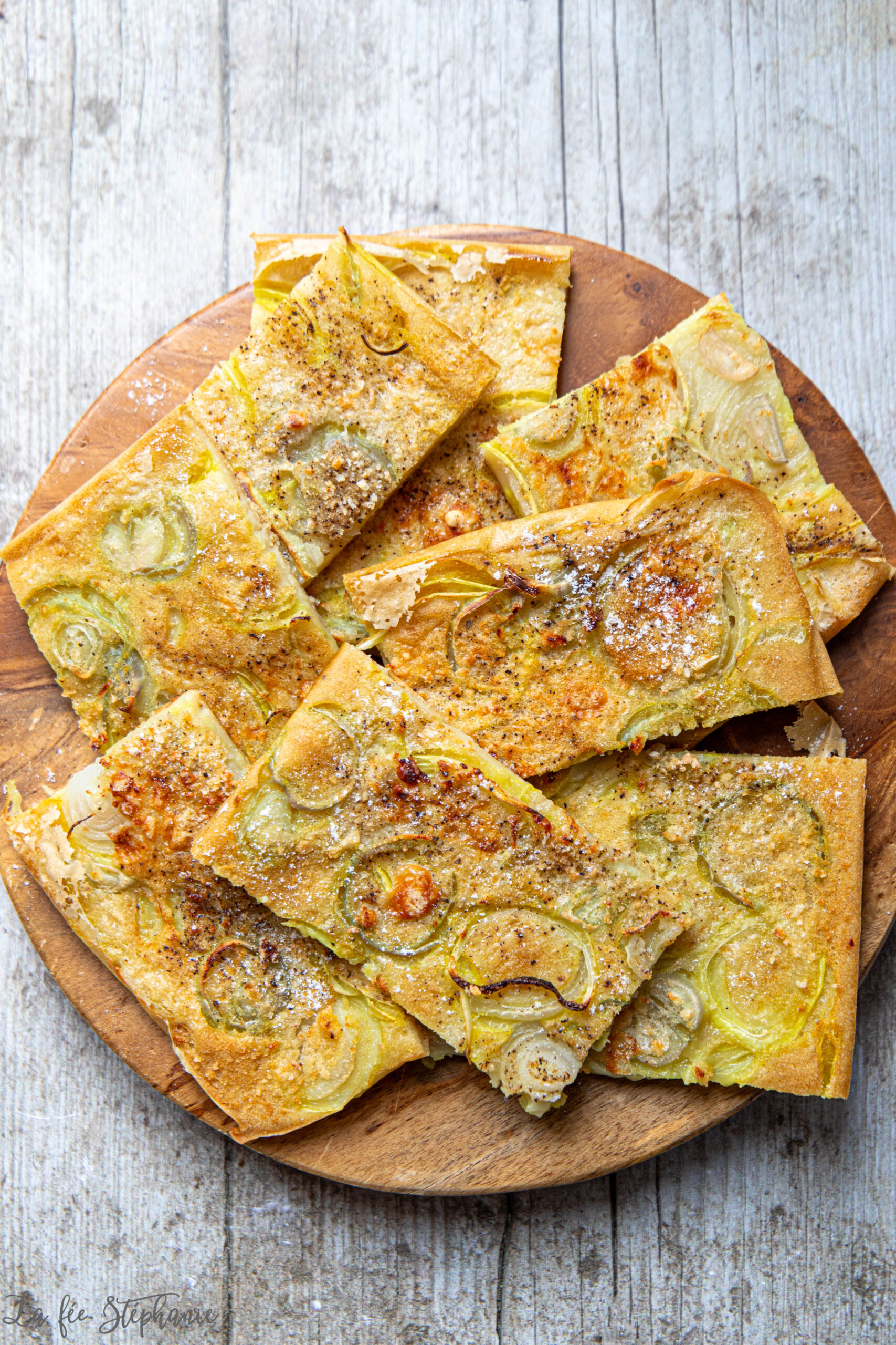 3.Disposer les oignons coupés en rondelles sur toute la pâte, saupoudrer de chapelure, de parmesan végétal si vous voulez et poivrer au moulin. Arroser d’une filet d’huile d’olive et enfourner 20-25 minutes (selon l’épaisseur de la pâte) à 210°C.
