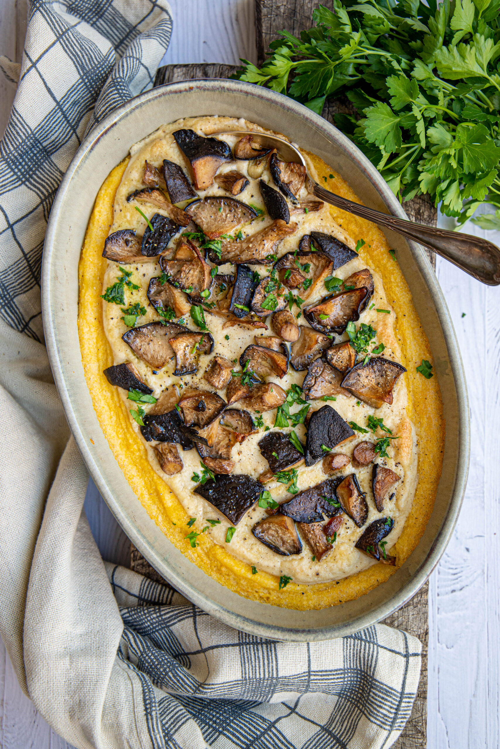 6. Couvrir la polenta de fromage végétal de cajou et de champignons. Arroser d’un filet d’huile d’olive, poivrer au moulin et enfourner à 210°C pendant 20 minutes jusqu’à ce que la polenta soit bien dorée. garnir de persil fraîchement ciselé.