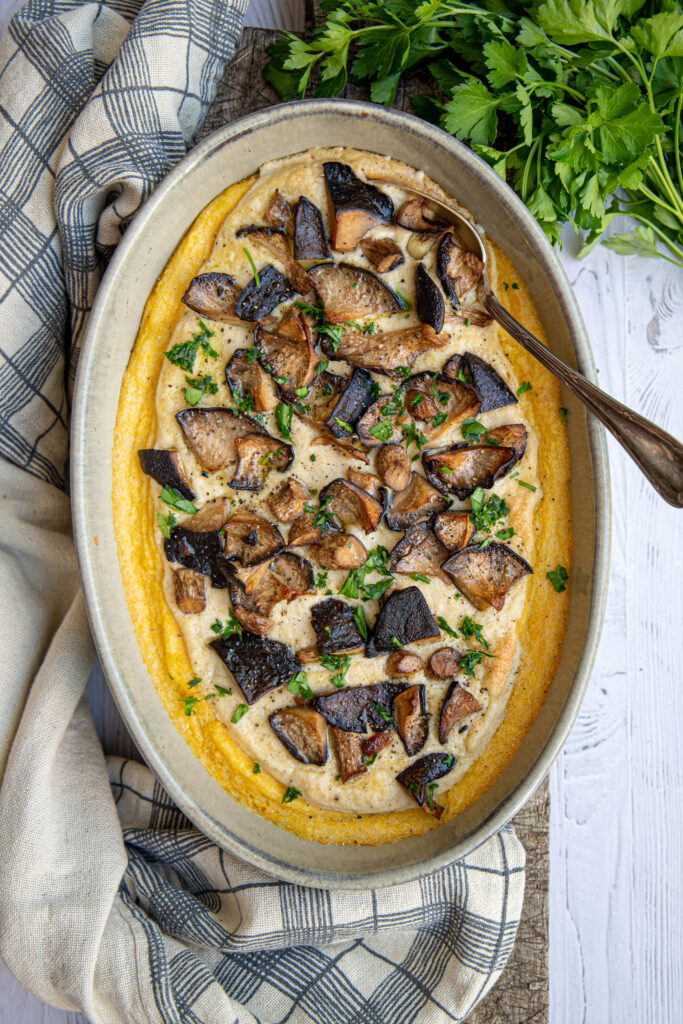C’est vraiment une recette d’hiver : la polenta aux champignons. Pour la rendre encore plus gourmande, je l’accompagne d’un fromage végétal à base de noix de cajou, que vous pourrez utiliser ici ou dans n’importe quelle autre recette nécessitant du fromage fondu. Je l’adore également dans des panini avec des épinards… un vrai délice !