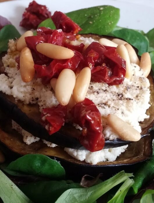 Millefeuille d’aubergines grillées et de fromage frais végétal aux tomates confites, lit de salade verte