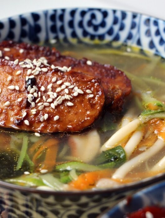 Soupe chinoise aux mille légumes et au miso, tempeh mariné et grillé
